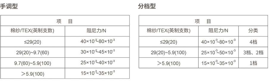 常見試紡純棉及混紡紗線密度與所需阻尼力調節范圍: